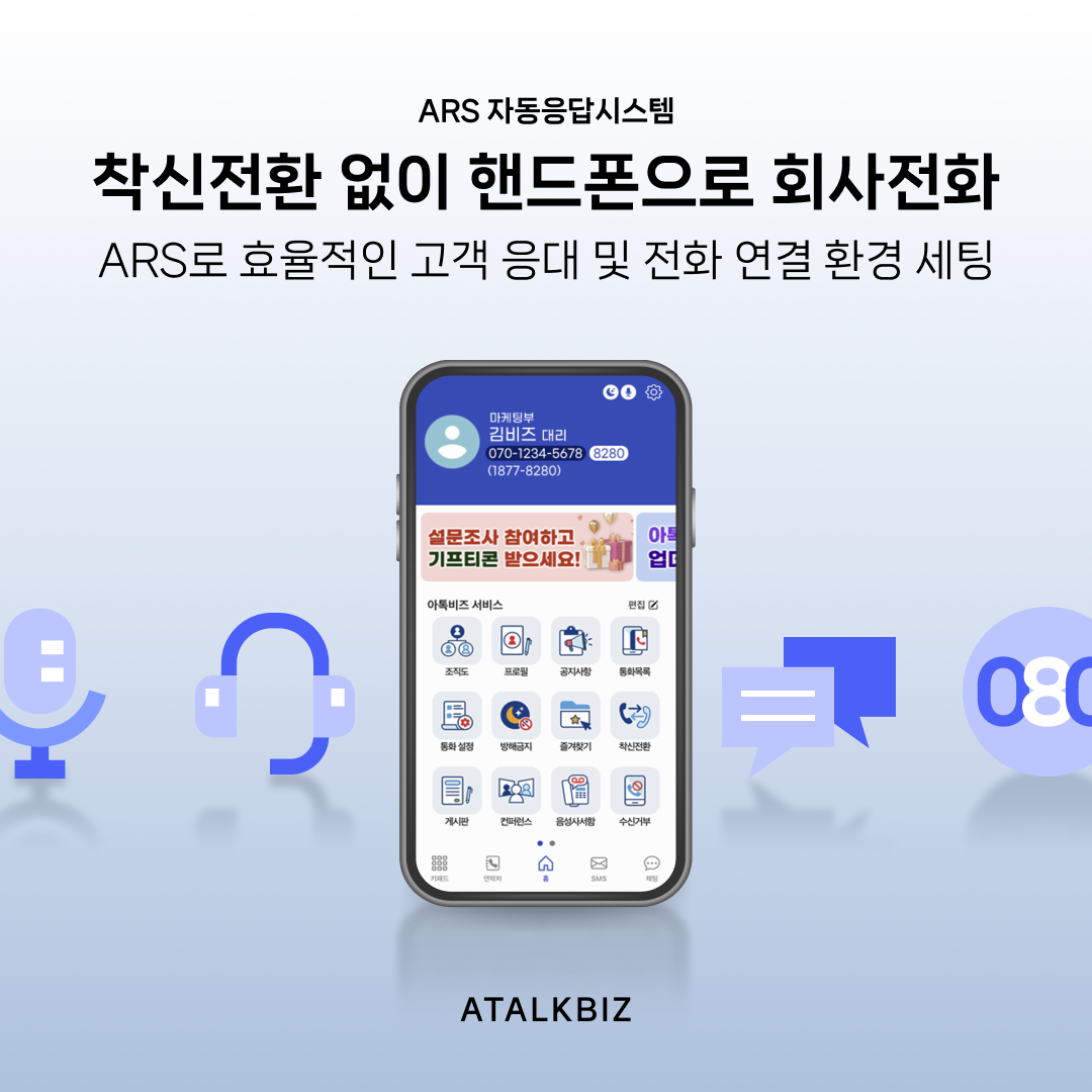아톡비즈 서비스를 활용하여 착신전환 없이 PC와 모바일 앱에서 언제 어디서나 회사전화 기능을 이용할 수 있으며, 자동음성안내 ARS 서비스로 효율적인 고객응대 및 전화연결 환경을 세팅할 수 있습니다.