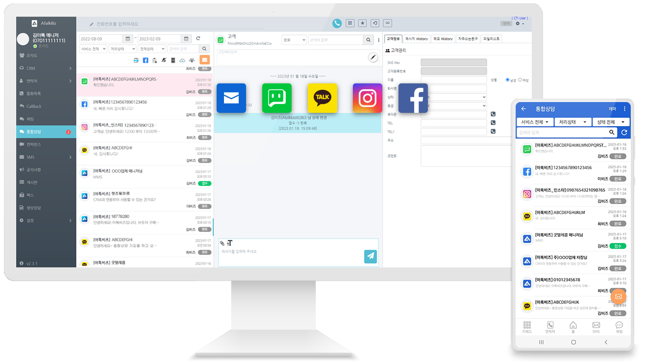 문자, 카카오 채널톡, 네이버 톡톡, 인스타, 페이스북 채팅상담을 한 곳에 모아서 한번에 응대할 수 있습니다.