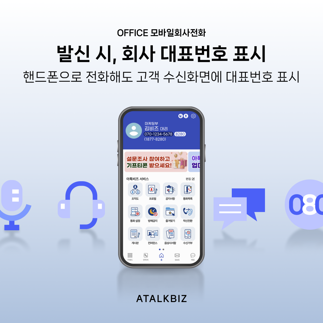 ➤ 아톡비즈 오피스를 사용하시면, 전화를 걸때에도 고객에게 회사 대표전화번호로 표시됩니다. 개인번호 노출 없이 사무실 전화를 사용할 수 있어요. 모바일 뿐만 아니라 Web에서도 사용이 가능합니다.