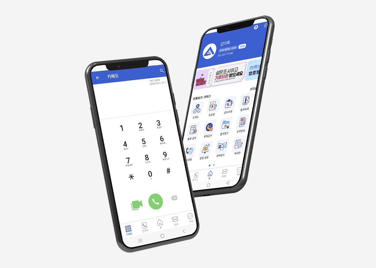 아톡비즈 Office 서비스는 내선전화와 메신저가 연동되어 있는 서비스에요. 아톡비즈 회사전화를 사용하시면 사내메신저, 조직도, 게시판 등의 협업툴을 무료로 제공해 드립니다. 기존 회사전화를 사용하고 있더라도 아톡비즈로 번호이동을 하면 그대로 번호 사용이 가능합니다.