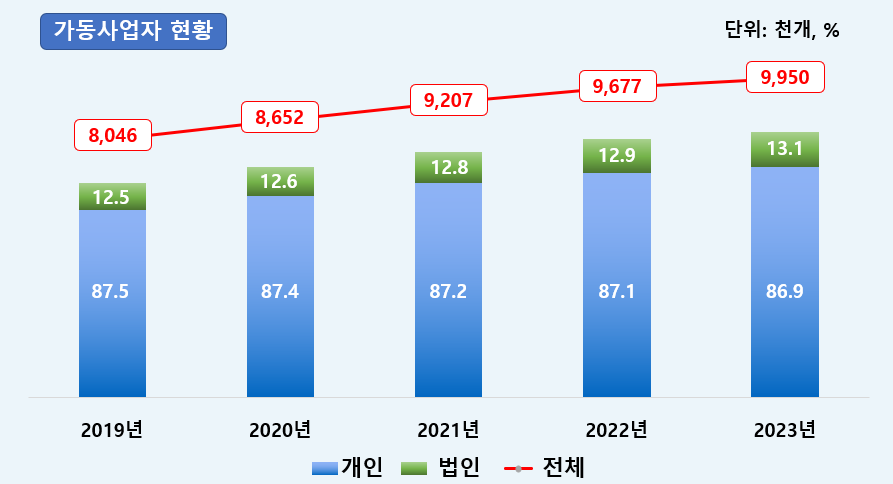 본론에 들어가기 앞서 현재 사업자 현황을 먼저 살펴보도록 하겠습니다. 이제 우리나라는 사업자 1000만 시대를 눈 앞에 두고 있는데요. 국세청이 지난해 사업자등록과 부가가치세 신고 현황을 분석한 결과 가동사업자는 995만개로 전년 967만7000개 대비 27만3000개(2.8%) 증가했다고 밝혔습니다. 사업자수가 가장 많은 업태는 부동산임대업 243만 개(24.4%), 서비스업이 205만 개(20.6%), 소매업 146만 개(14.7%) 등의 순서였다고 합니다!
