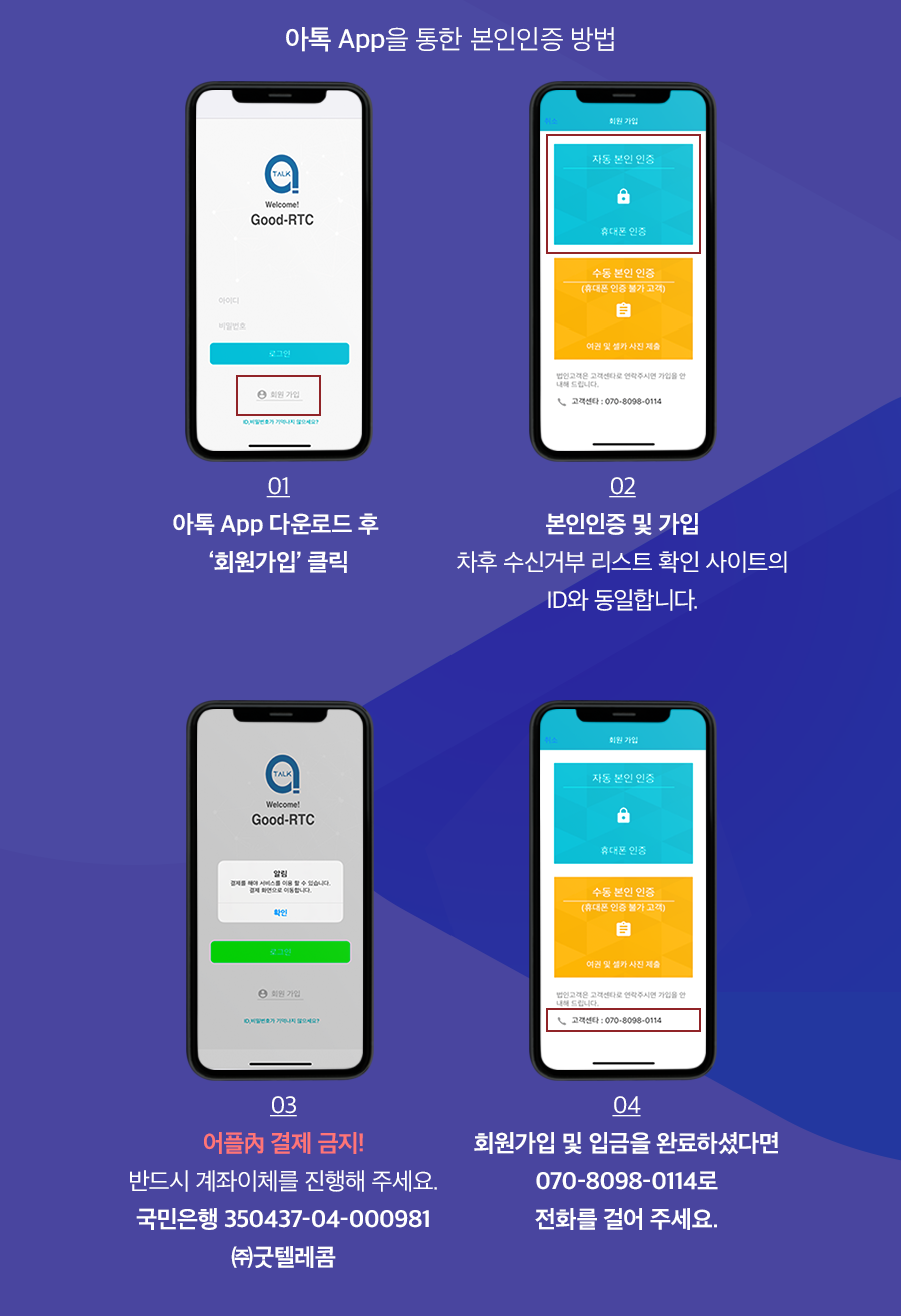 아톡에서는 고객님들의 편의를 생각하여 간단한 신청 절차로 080수신거부 서비스를 이용하실 수 있게 제작하였으며, 타사에 비해 저렴한요금과 1일이라는 빠른 개통시간을 제공해드립니다.
