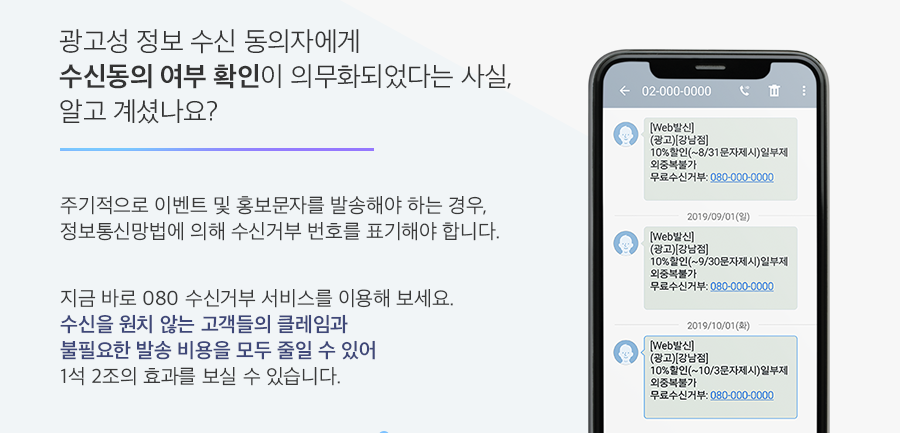 광고, 홍보 문자를 받고싶지 않은 고객들의 클레임을 줄일 수 있고 수신을 원치않는 고객들을 제외하고 문자를 전송을 하게되면 불필요한 문자 발송비용을 줄일 수 있어 1석 2조의 효과를 보실 수 있습니다:)