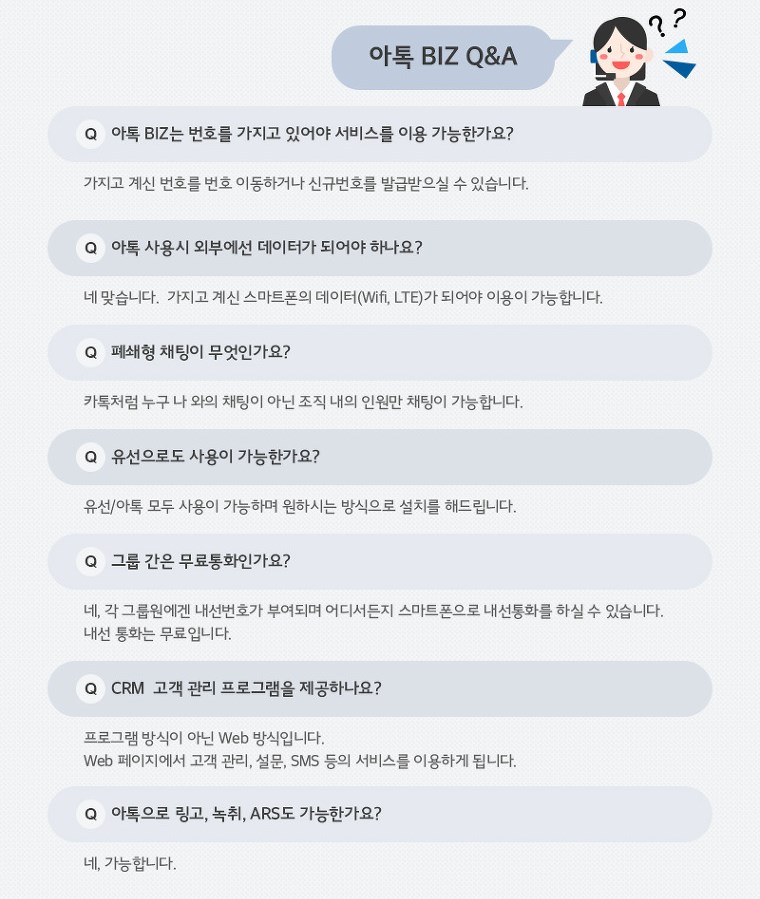 아톡비즈 서비스는 기존 사무실에서 사용하던 제약에서 벗어나 스마트폰 하나로 회사의 업무들을 진행할 수 있는 서비스를 제공합니다. 시간과 공간의 제약이 있던 기존 회사 전화시스템을 사무실 에서만 사용하는 것이 아닌 외부 / 재택 / 해외 에서도 회사업무를 할 수 있도록 제공해 드립니다. 아톡비즈 서비스를 이용하시는 가입자분들 께서는 PC와 유선에서 모바일로 전체적인 업무를 진행하실 수 있습니다.