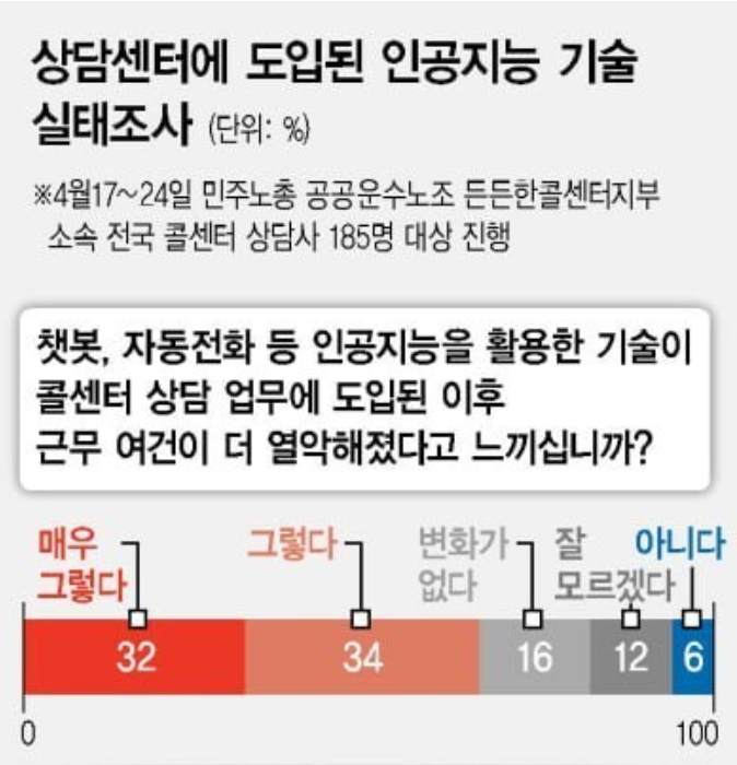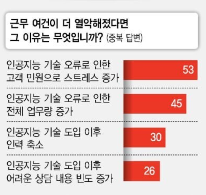 실제로 인공지능(AI) 기술을 도입한 뒤 상담센터에서 업무중인 상담원을 대상으로 조사를 한 결과 근무 여건이 훨씬 좋아지기 보다도 열악해졌다는 의견도 있어 AI를 도입하는데 있어서 여러 방면으로 고민을 해보고 하셔야 할 것 같습니다.