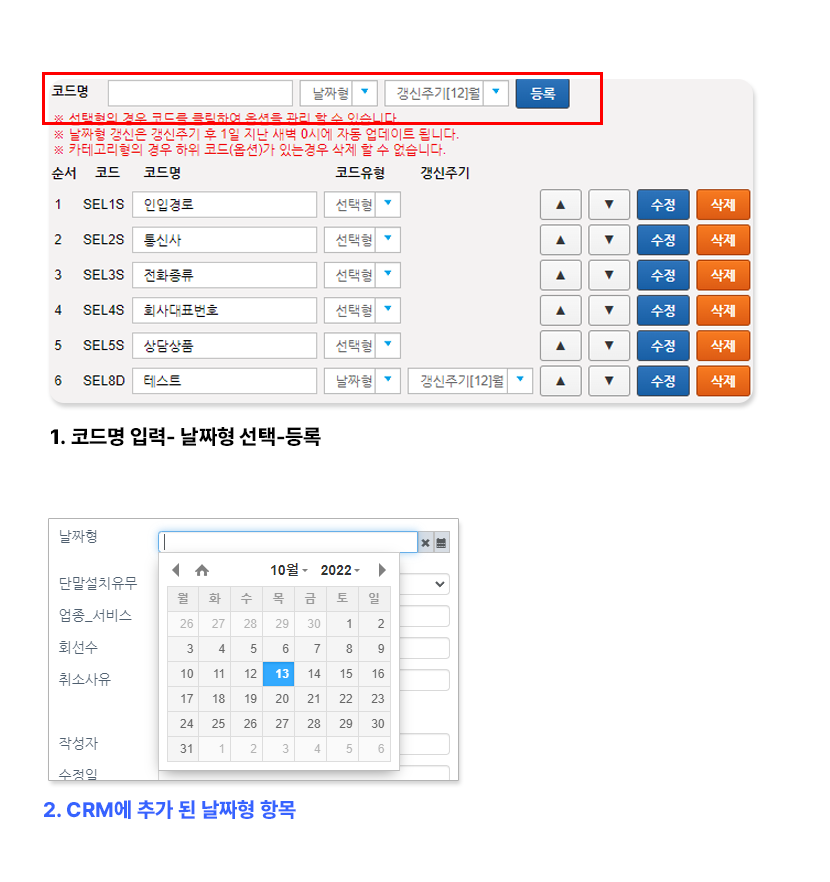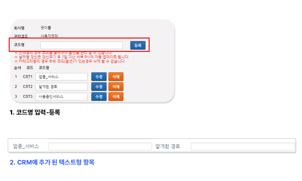 고객관리, 상담관리에서는 기본적으로 제공하는 항목도 있기 때문에 항목을 생성했을 때 표시 되는 영역이 있습니다.