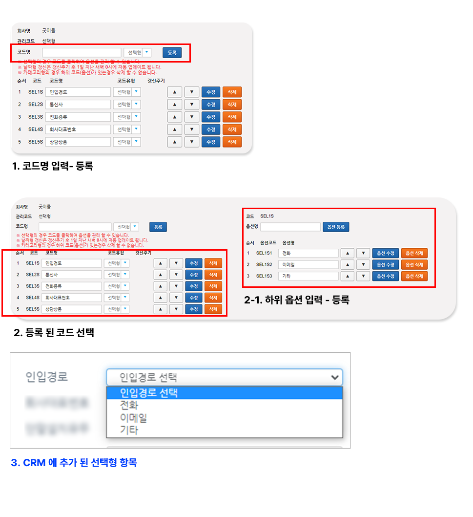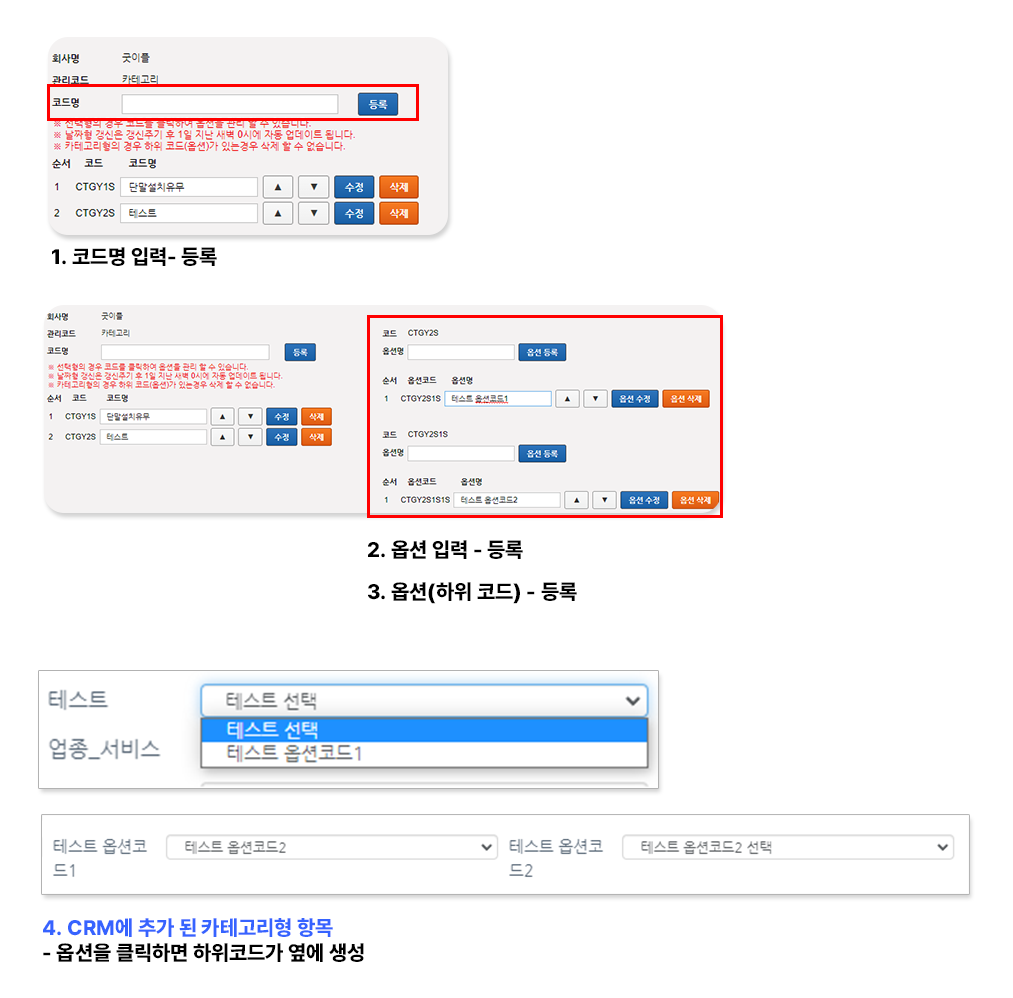 3. 등록한 코드 선택 후 하위 옵션 입력, 등록