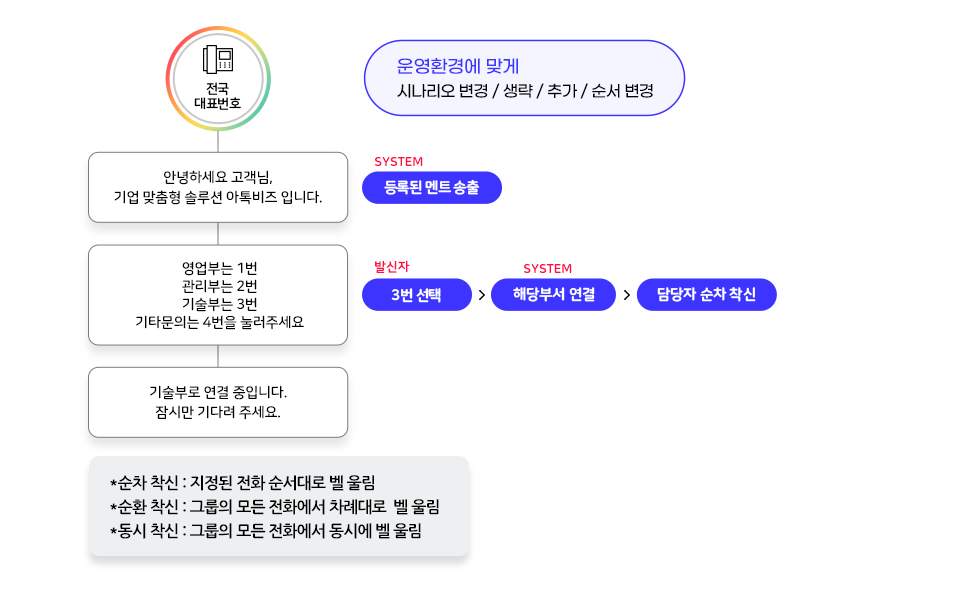 ex) 전화 인입 시 고객센터 내 동시착신 / A부서 순차 착신 등