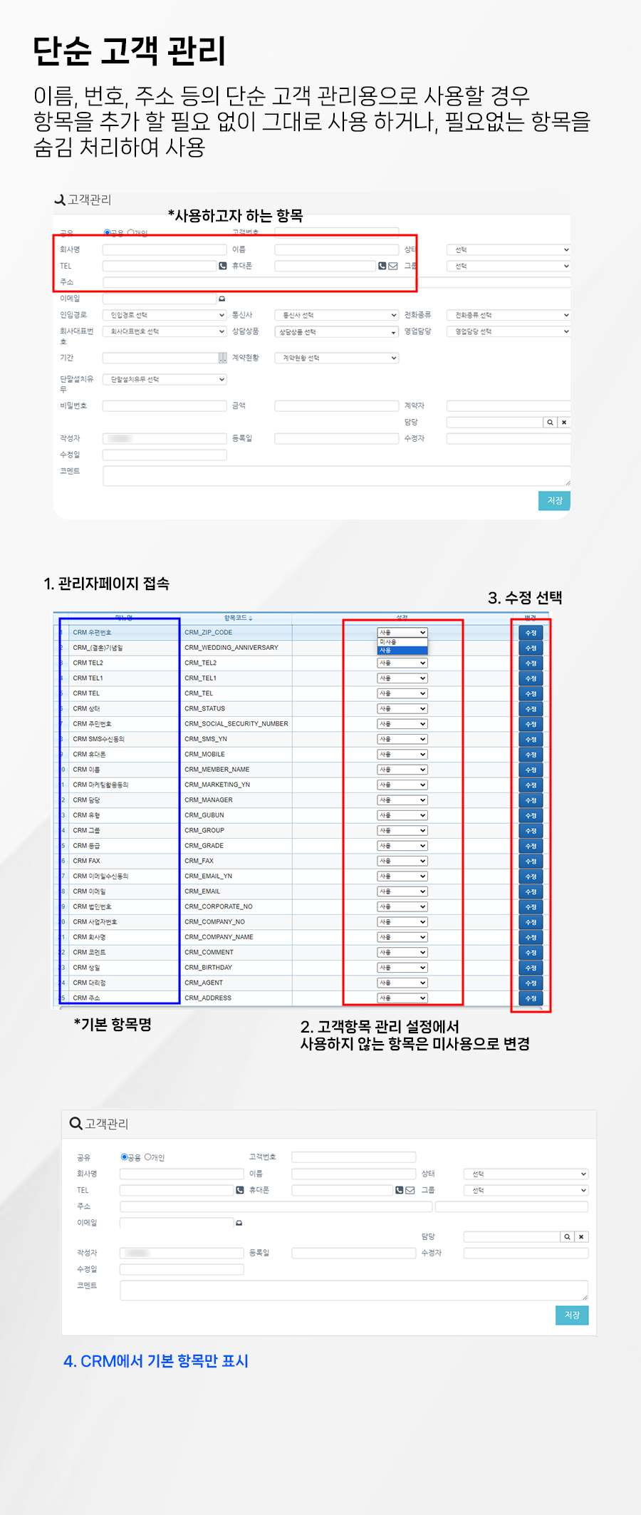 굳이 많은 정보를 등록할 필요 없이 고객의 기본 정보만 등록하고자 한다면 항목을 추가할 필요가 없어요.