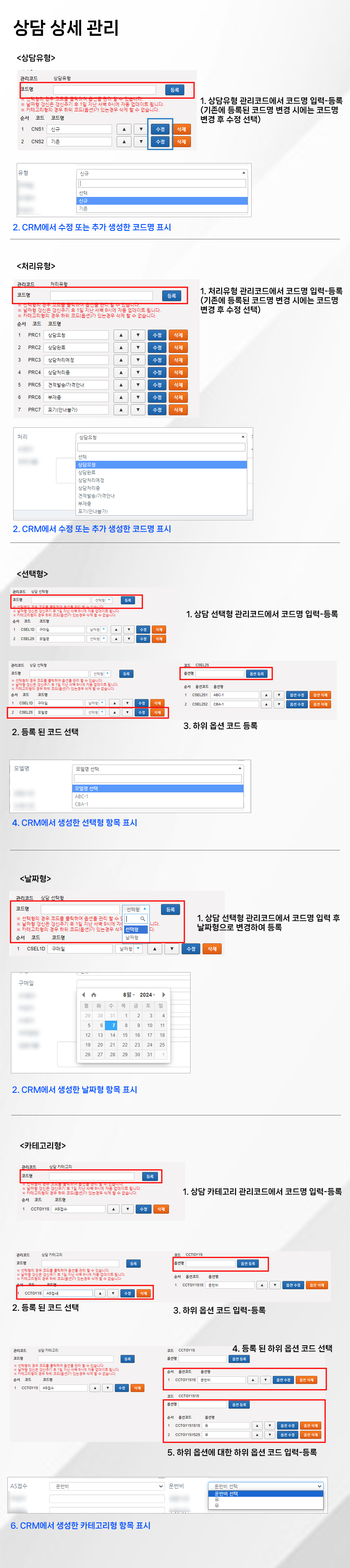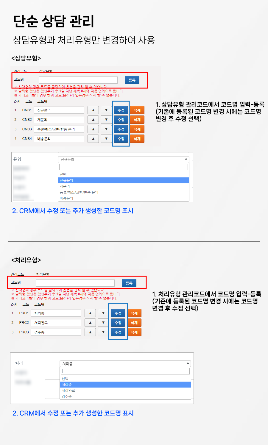 □ 단순 상담 관리 - 상담유형, 처리유형 하위 옵션 생성