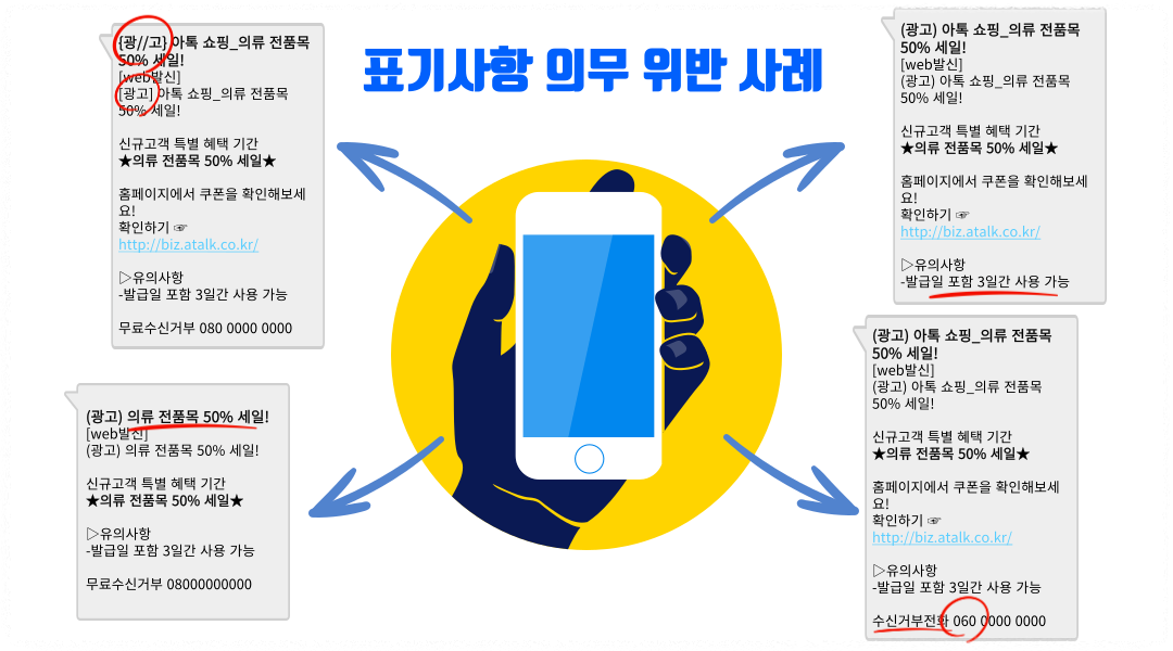 | ◾이용자의 사전 동의를 받지 않은 경우 ◾수신거부 의사 표시를 무시한 경우 ◾야간 문자 ◾금지사항 광고(도박, 불법 의료품, 주식 등) ◾수신 거부 시 수신자의 비용 부담 ◾표기 의무사항 위반 |