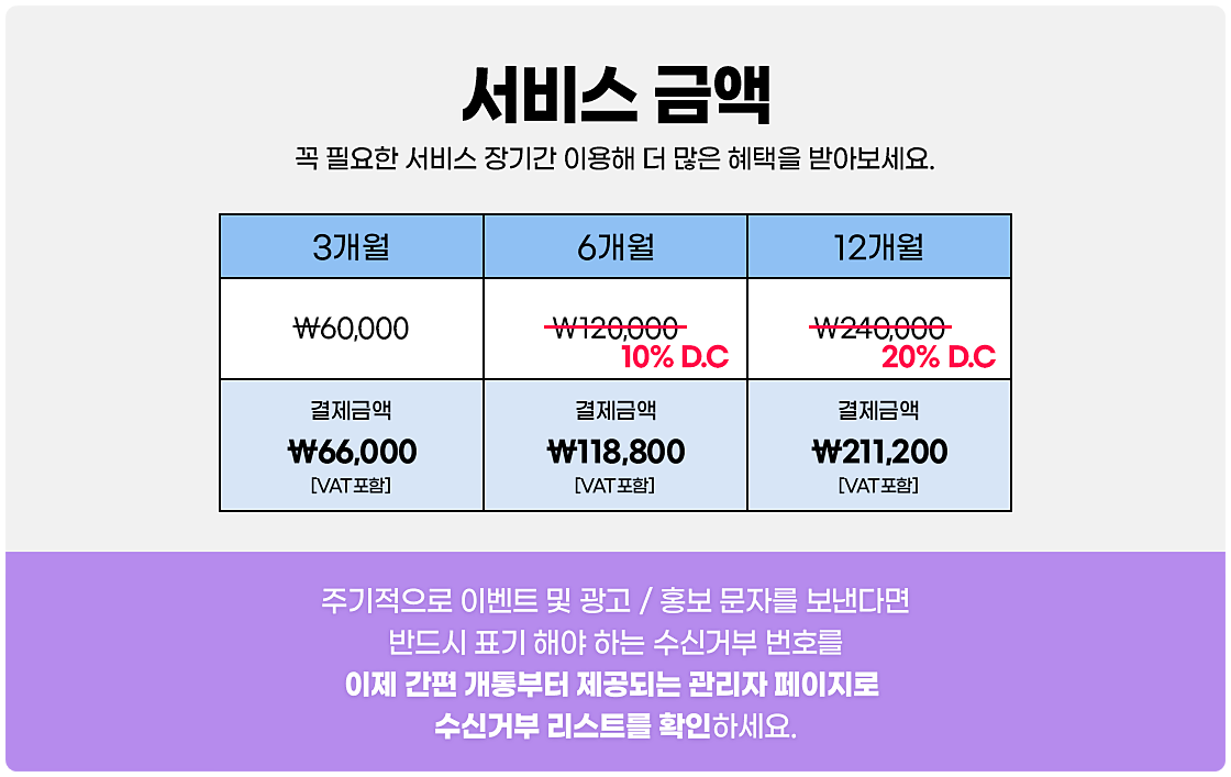 장기간 이용할수록 가격도 부담 없어서 기업, 학원, 병원, 헬스장, 필라테스 등 광고문자를 주기적으로 보내는 경우 더 가성비 있게 사용할 수 있습니다.