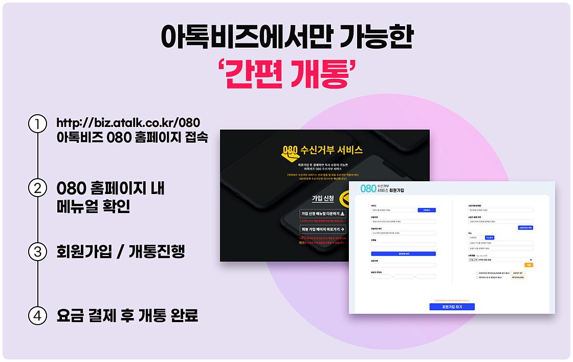 그렇기 때문에 아톡비즈 080무료수신거부 번호 서비스와 같이 개별 번호가 부여되며, 수신거부 리스트 관리도 간편하고 개통과정도 쉬운 곳에서의 개통을 추천드립니다.
