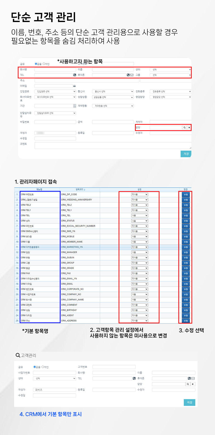 CRM에서 가장 많이 사용하는 고객별 메모 기능도 사용하지 않고 회사명이나 고객명, 전화번호만 등록하여 단순 고객관리만 하는 기업이 있습니다. 이때는 특별히 추가할 필요 없이 숨김 처리 기능만 사용하면 되는데, 관리자 페이지에서 사용하지 않는 기본 항목을들 미사용으로 설정만 해주시면 됩니다.