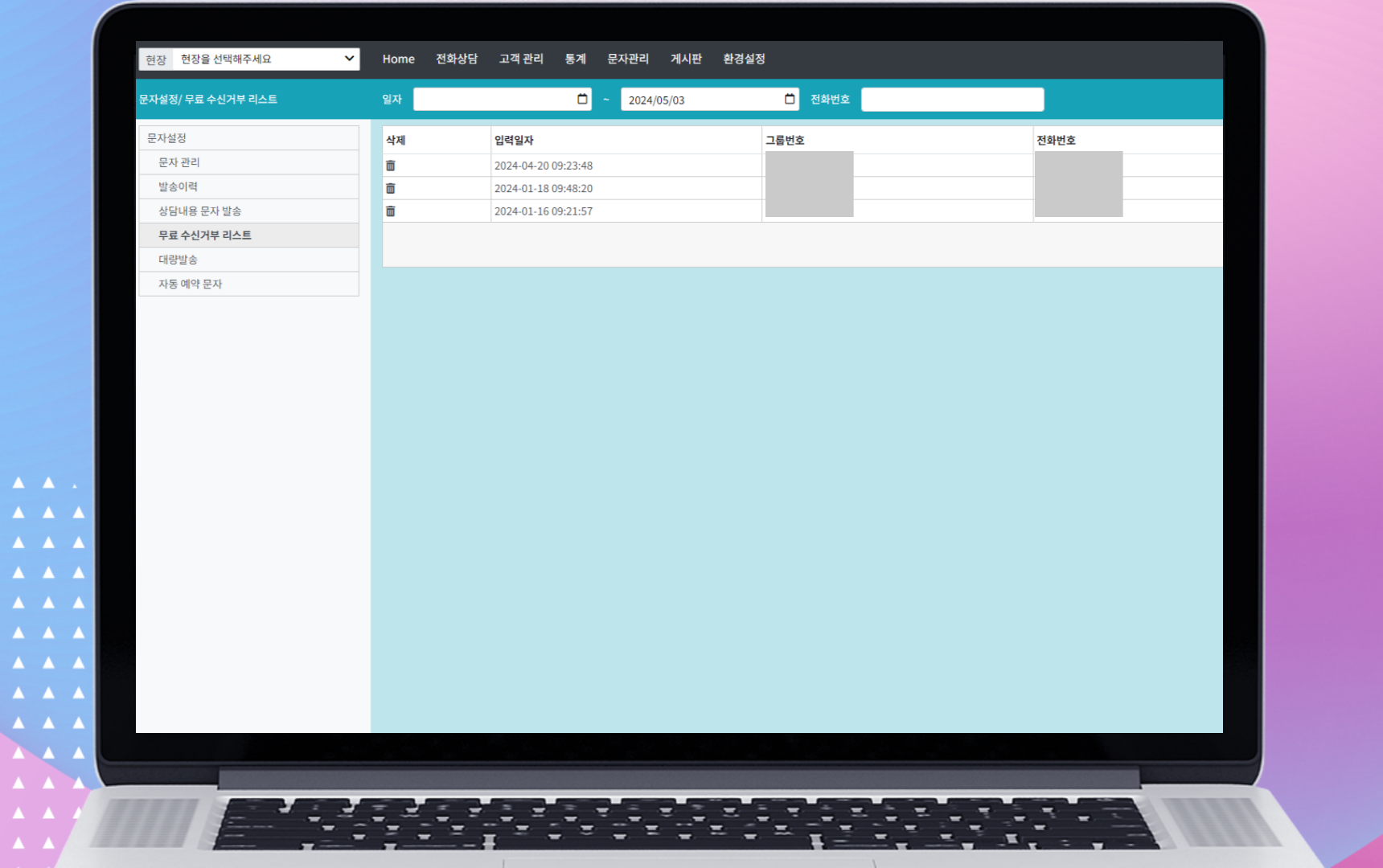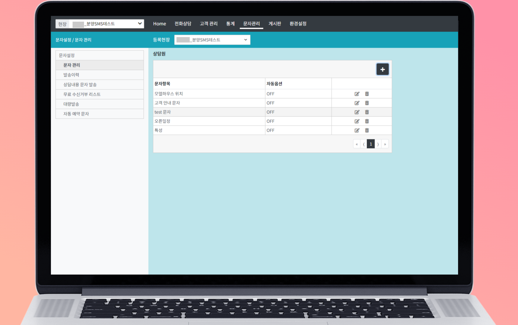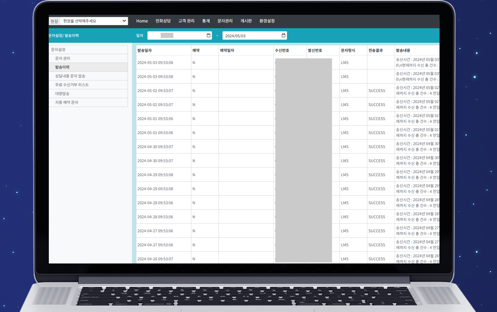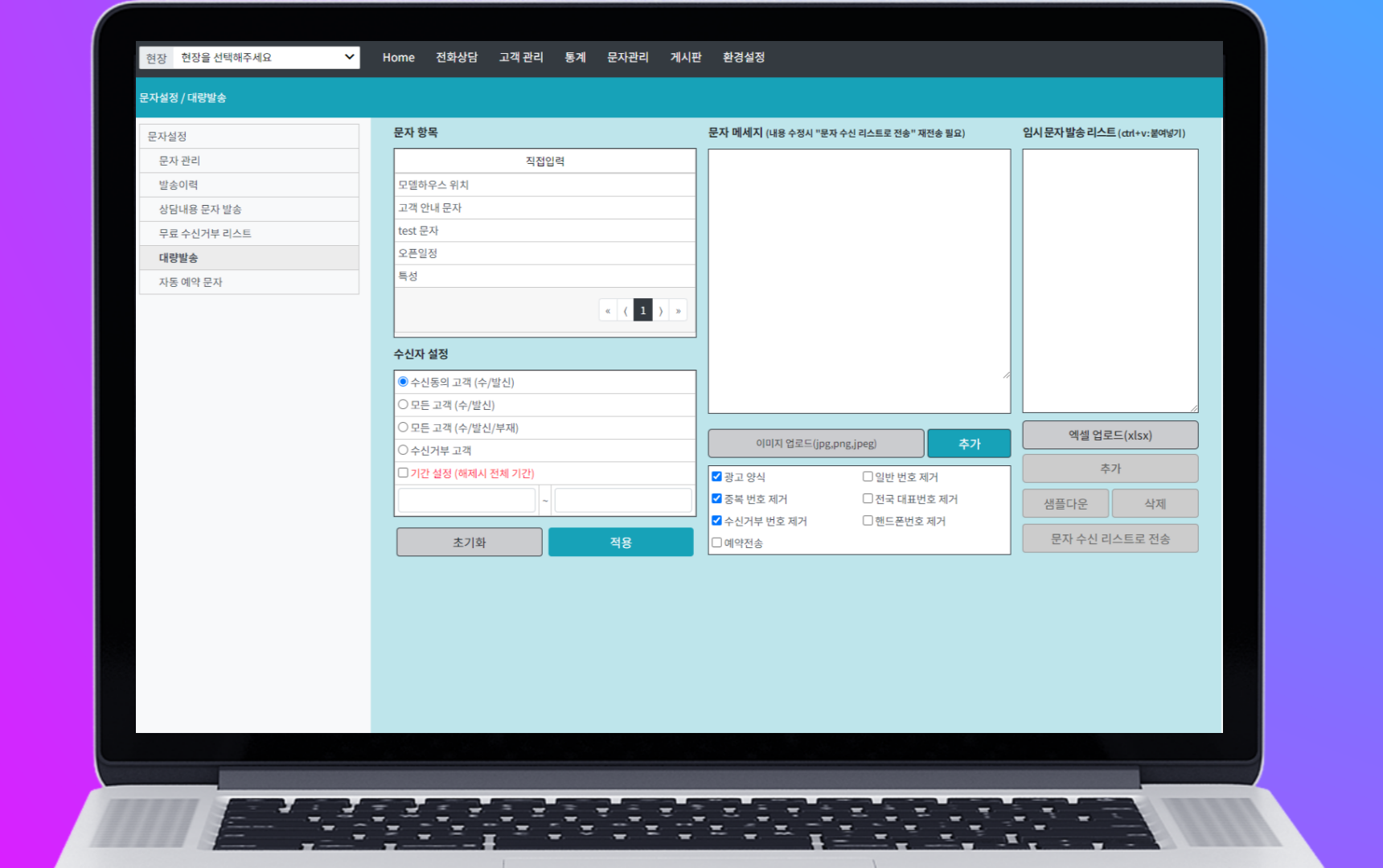 | 문자관리 | 발송이력 | 상담내용 문자발송 | 무료 수신거부 리스트 | 대량발송 | 자동 예약 문자 |