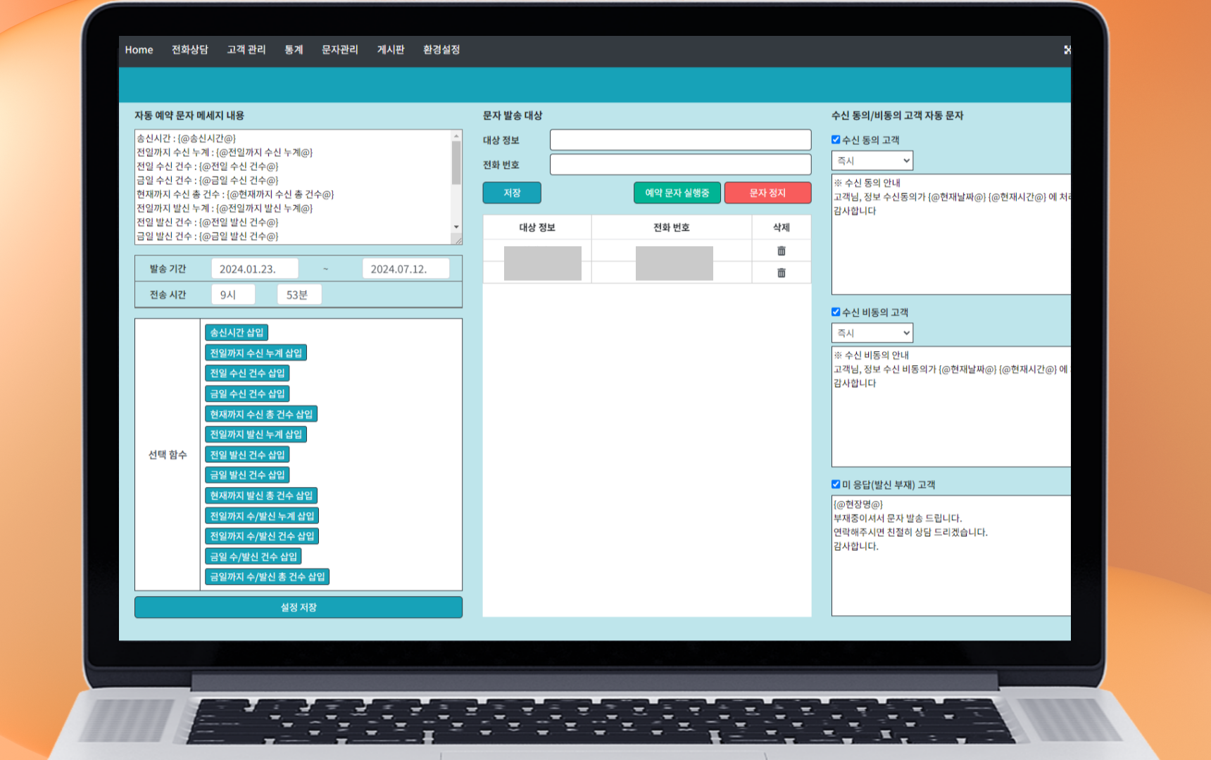 또한 자주 사용하는 내용을 단어로 함축시킨 뒤 저장하여 필요할 때 클릭하면 문자 내용이 자동으로 입력되도록 하는 '치환문자' 기능이 있어 문자를 작성하는데 시간을 절약할 수 있습니다. 업무 중 필요 시, 수신 동의고객/미응답 고객/ 비동의 고객에게 자동문자를 발송할 수 있습니다.