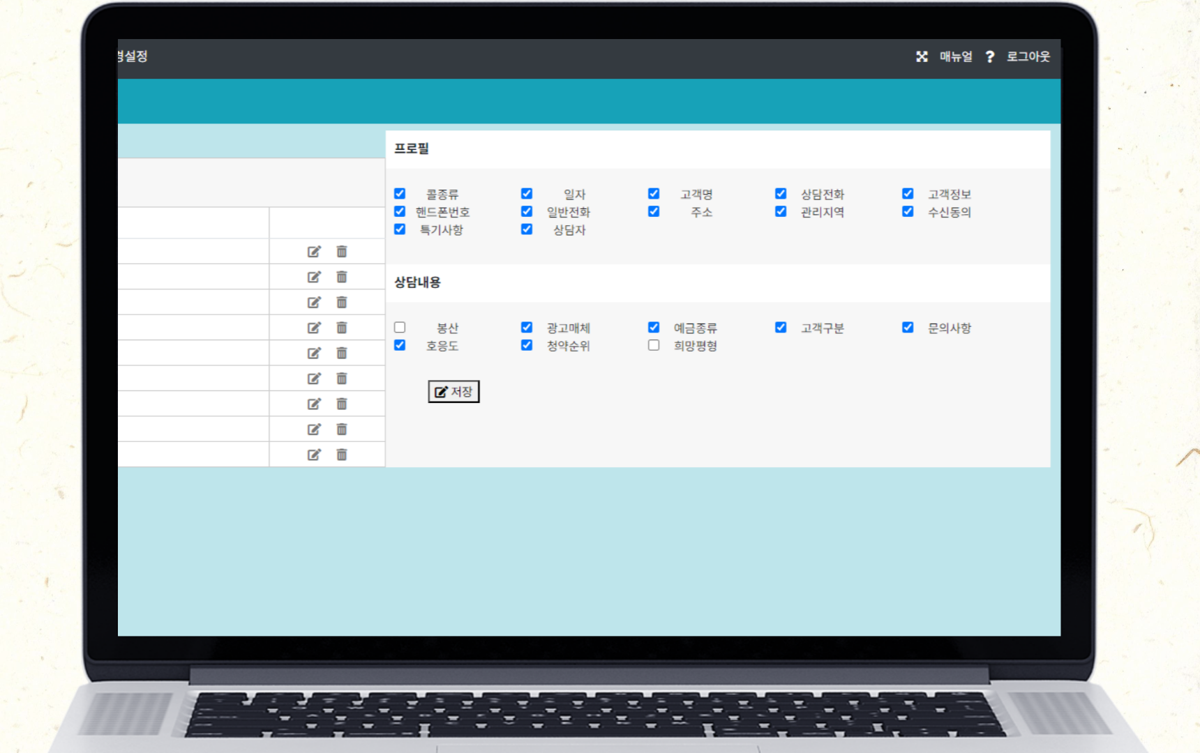 또한 콜종류,고객명,고객정보 등의 프로필과 예금종류,문의사항등의 상담내용 항목을 지정하여 저장할 수 있어 사용자의 맞춤형으로 설정이 가능하고, 언제든지 필요할 때 해제-선택이 가능합니다.