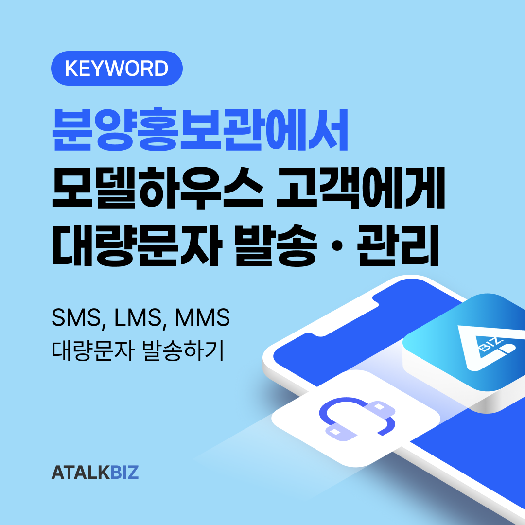 분양홍보관,모델하우스,분양대행사에서 업무를 볼 때, 고객에게 문자를 보내야 하는 일이 많습니다. 아톡비즈 에서는 분양대행사,분양홍보관에서 SMS,LMS,MSM,대량문자 등 각종의 다양한 방식의 문자 발신 서비스를 제공하고 있습니다.