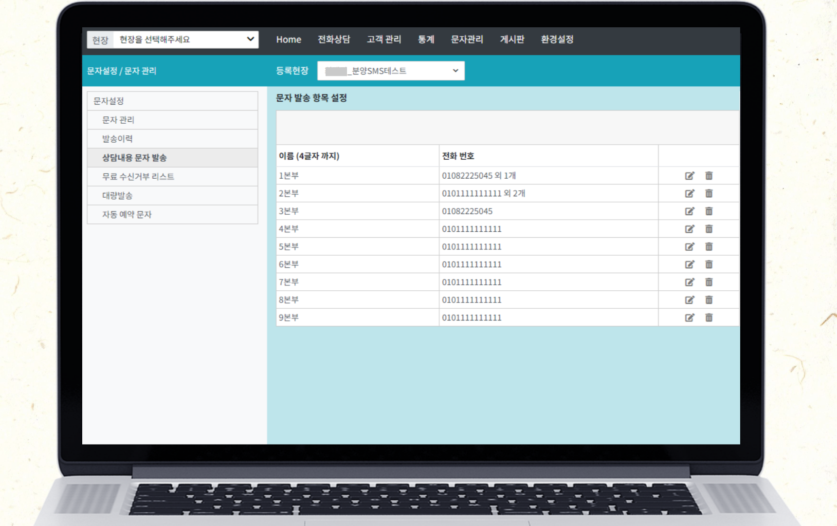 | 문자관리 | 발송이력 | 상담내용 문자발송 | 무료 수신거부 리스트 | 대량발송 | 자동 예약 문자 |