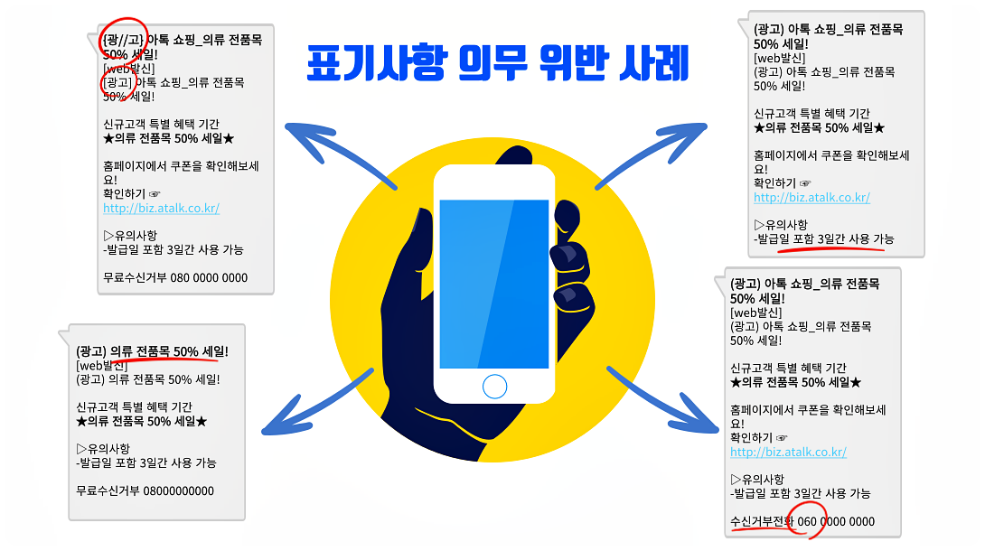 위반 사례들을 참고하여 대량 광고 문자를 발송하지 않으면 스팸문자로 분류되게 됩니다.