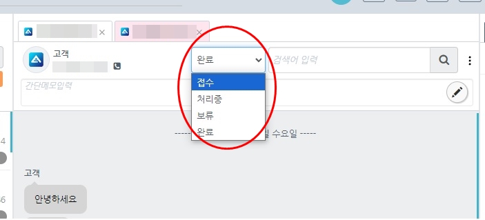 처리상태 변경은 고객과의 채팅룸에 들어간 후 고객 명 옆의 탭을 눌러 변경할 수 있어요.