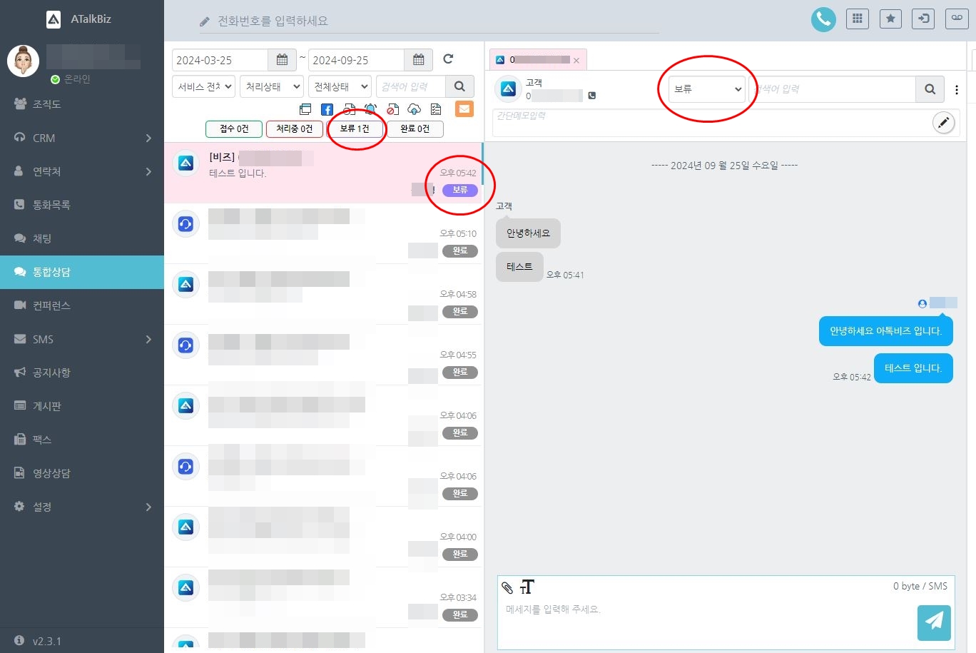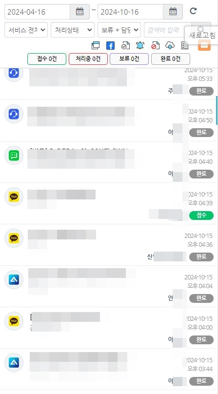 이 때 채팅방 목록 상단에서 내가 보류,처리중,접수,완료 설정한 채팅 건수도 확인할 수 있어요.
