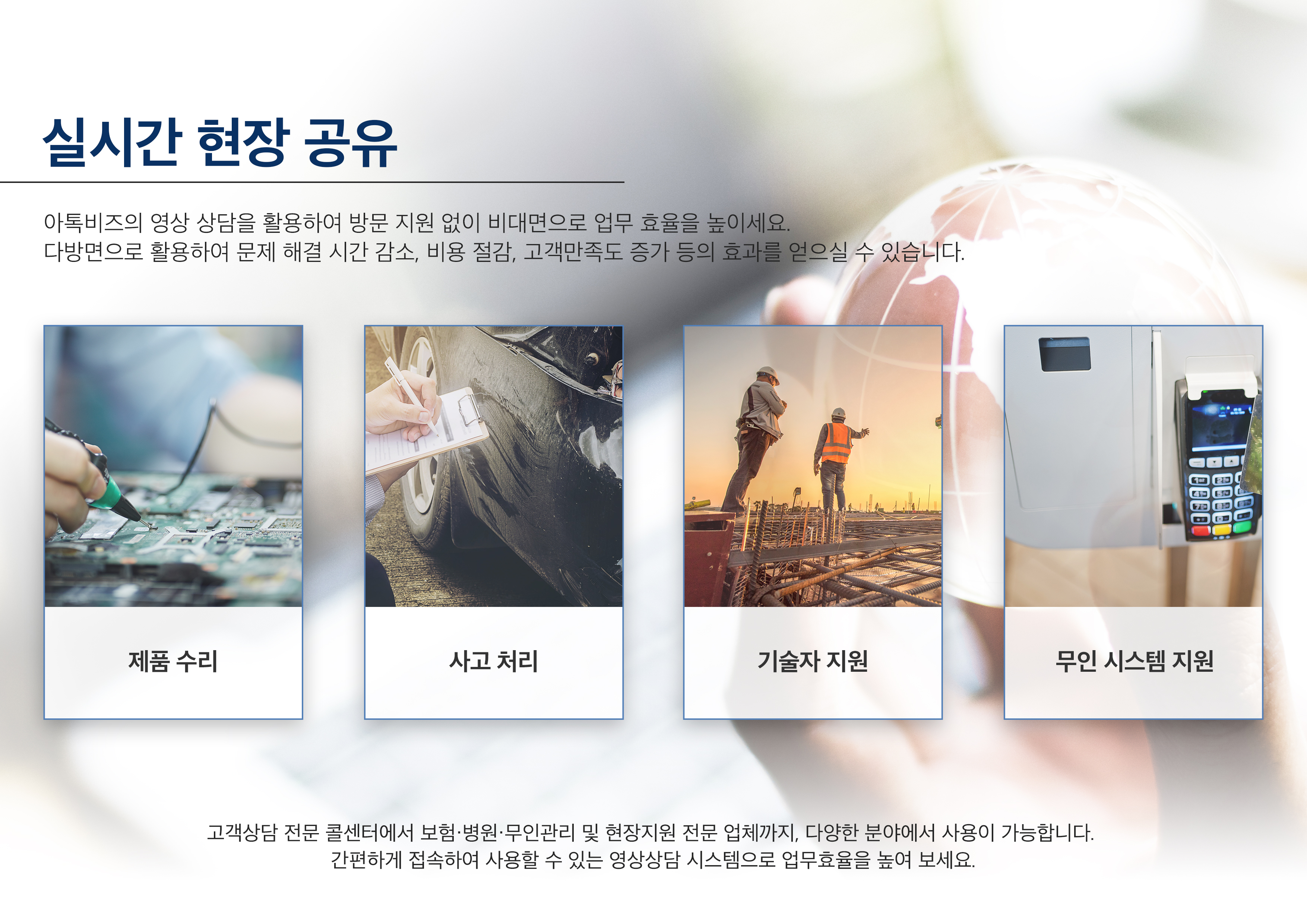 아톡비즈 영상상담 시스템을 활용하여 방문 지원 없이 비대면으로 업무 효율을 높여보세요, 다방면으로 활용하여 문제 해결 시간 감소, 비용 절감, 고객만족도 증가 등의 효과를 얻으실 수 있습니다.