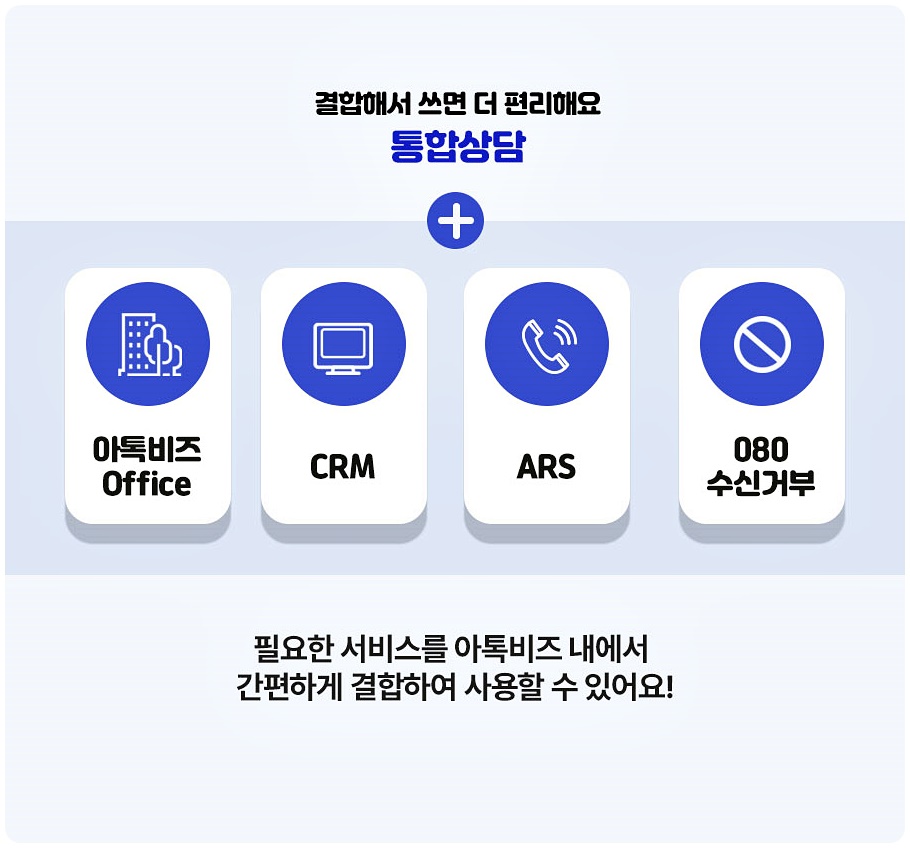 채팅상담 관리와 더불어 다른 솔루션도 필요하다면 복잡하게 여러 프로그램을 사용할 필요 없이 아톡비즈 하나로 모든 기능을 결합해서 사용할 수 있어 편리합니다.