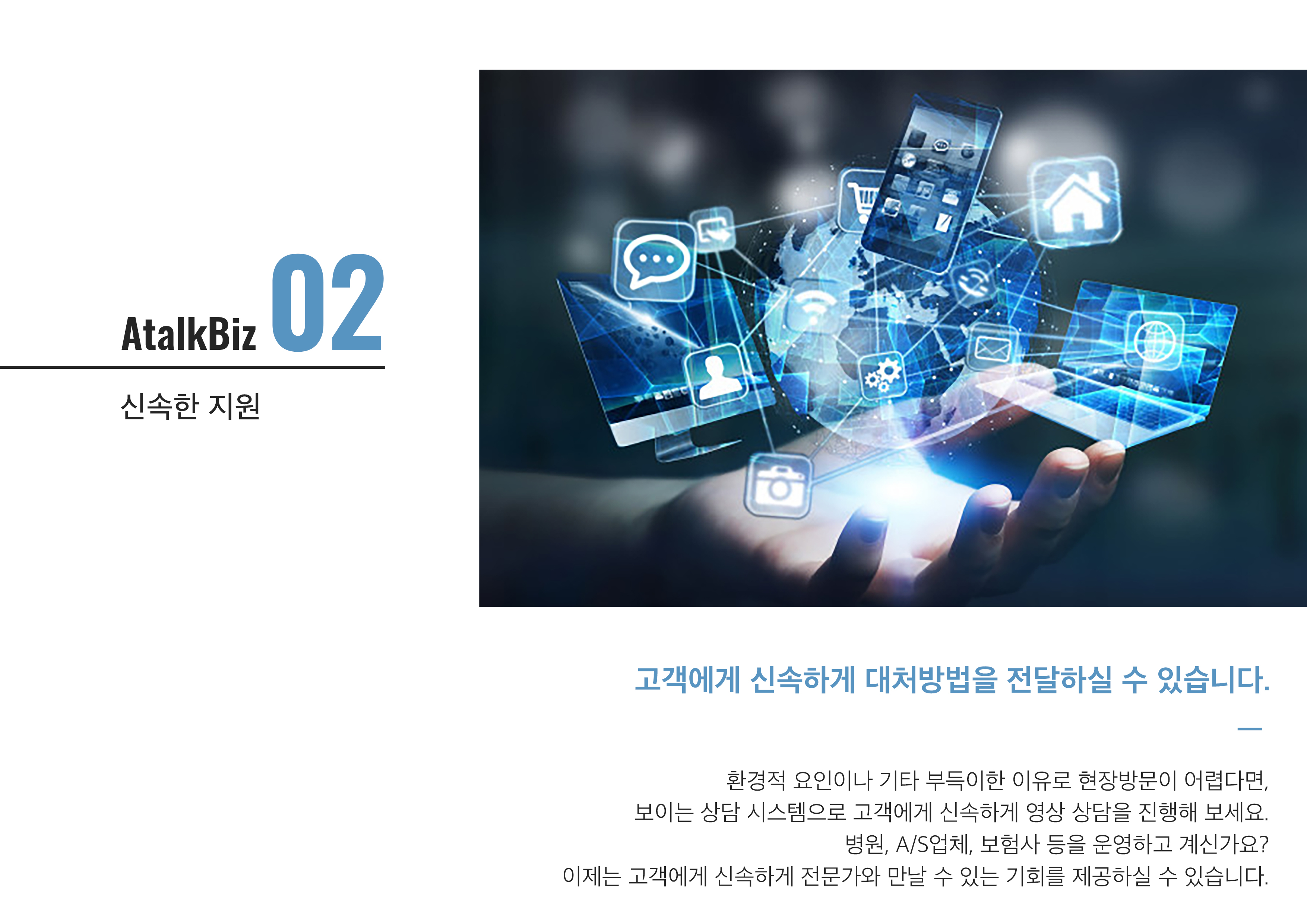 아톡비즈 영상상담 시스템을 활용하여 방문 지원 없이 비대면으로 업무 효율을 높여보세요, 다방면으로 활용하여 문제 해결 시간 감소, 비용 절감, 고객만족도 증가 등의 효과를 얻으실 수 있습니다.