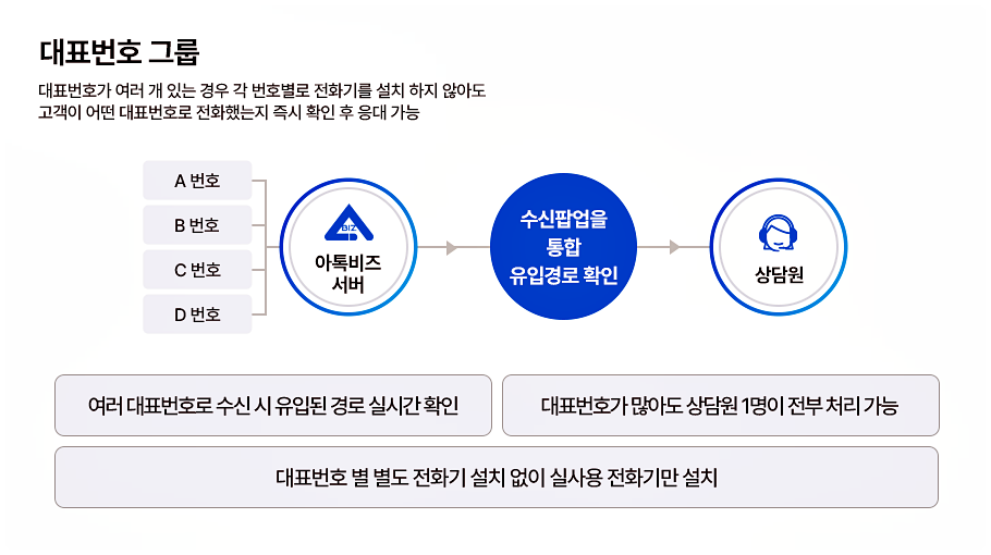어떤 대표번호로 유입된 통화인지 경로를 확인 후 한 전화기로 응대가 가능한 대표번호 그룹 등의 부가서비스로 여러 개의 대표번호 관리가 가능합니다.