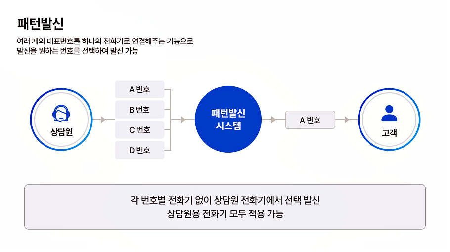 이런 경우 여러 개의 대표번호를 한 곳으로 모아 원하는 대표번호를 선택하여 발신할 수 있는 패턴발신,