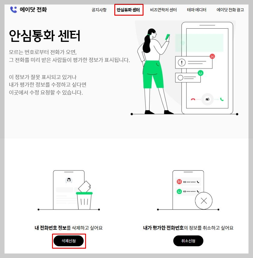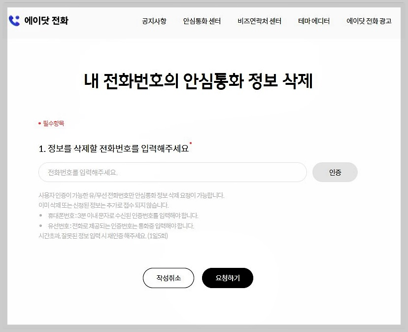 2. 안심통화 센터 탭에 들어간 후 하단의 '삭제신청' 클릭
