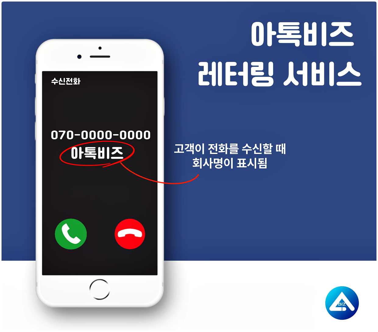 아톡비즈 레터링 서비스는 스팸번호가 늘어나면서 모르는 번호를 받지 않거나 070 번호는 무조건 스팸처리 하는 고객들 또한 증가함에 따라, 전화번호와 함께 회사명 / 브랜드명 / 특정 문구 등을 표시할 수 있게 만들어주는 아톡비즈 부가서비스입니다.
