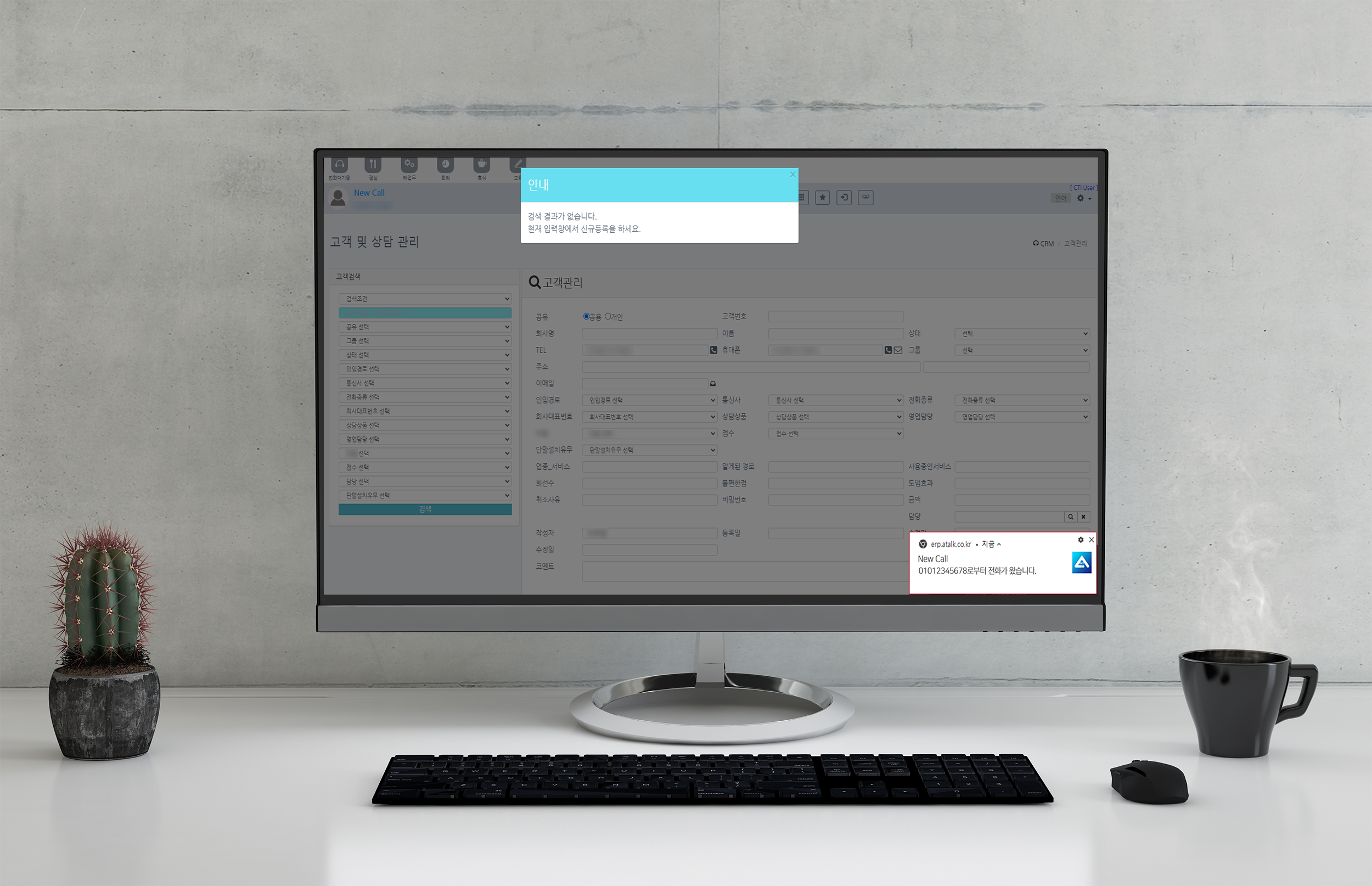 CRM은 전화가 오는 즉시 고객정보를 불러오지만 신규 고객에게 전화가 왔을 때는 정보를 불러올 고객 DB가 없기 때문에 고객명 대신 'New Call' 표시와 같이 번호만 팝업에 띄워주며 현재 CRM에서 신규등록하라는 안내 팝업을 띄워줘요.(2개의 팝업)