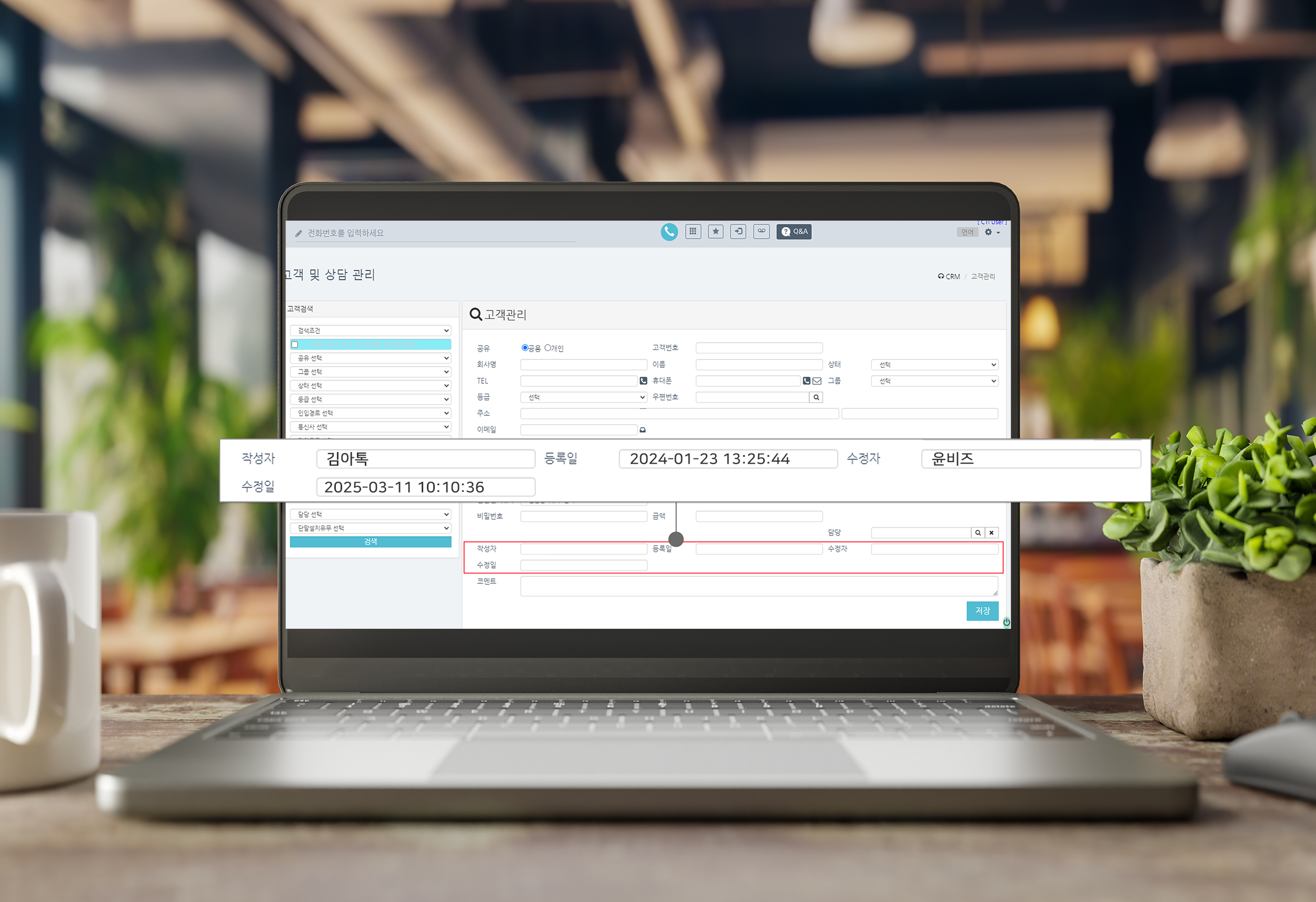 작성자는 신규 고객을 저장할 때 최초로 저장한 상담원의 이름, 등록일은 최초 등록일 및 시간을 표시합니다. 수정자는 등록 된 고객에 대한 정보를 마지막으로 수정한 상담원의 이름, 수정일은 수정자가 수정한 날짜와 시간을 표시합니다.