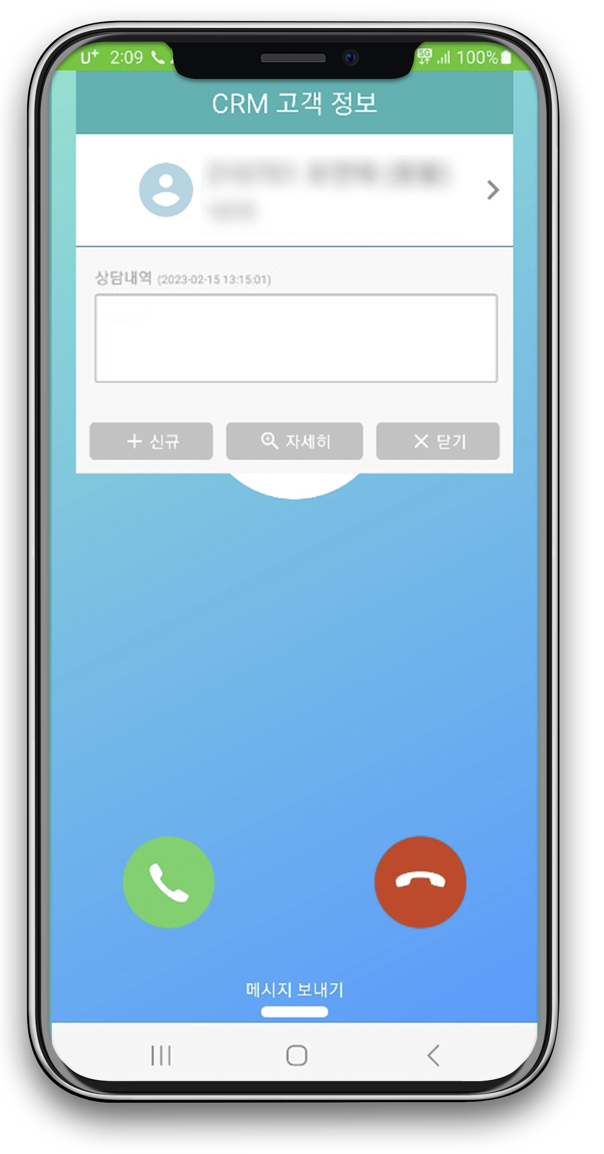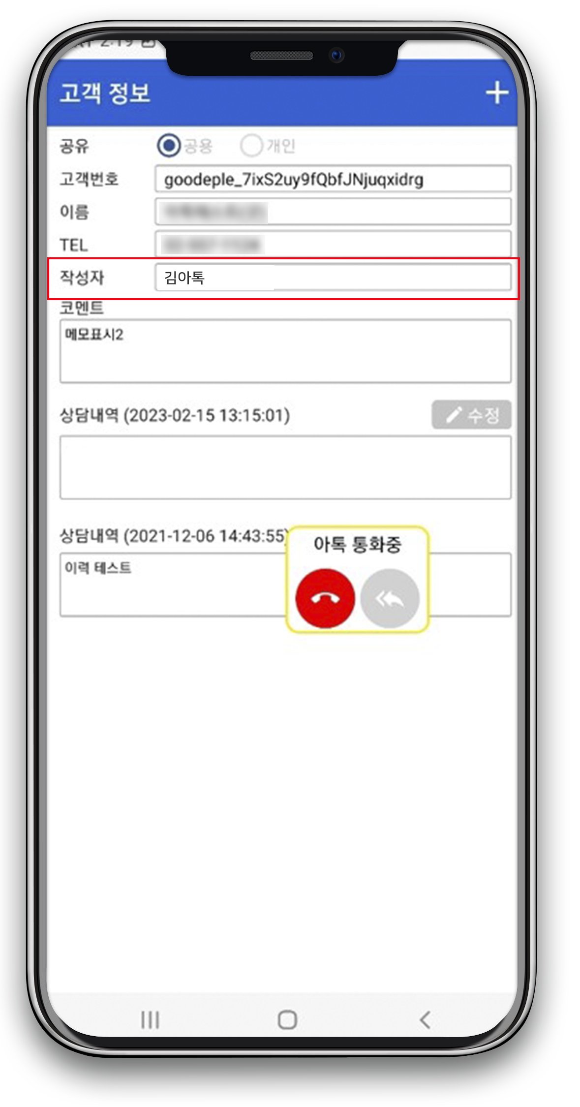 이후 현재 전화가 온 고객의 번호는 자동으로 입력 된 상태에서 고객과 상담을 진행하며 고객에 대한 정보를 입력 및 선택을 하여 저장할 수 있습니다. (모바일에서는 PC만큼 세부적으로 입력은 어렵지만 고객에 대한 간략한 정보를 입력 저장)