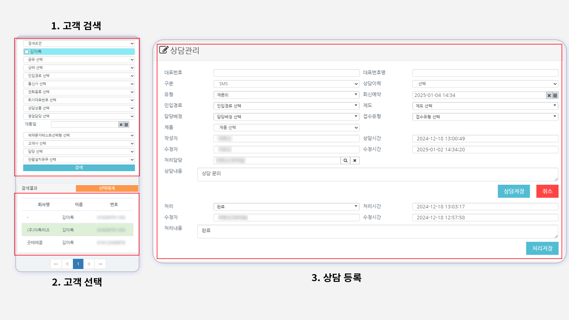 ① 고객 검색 ② 고객 정보 불러오기 ③ 상담 내용 등록하기