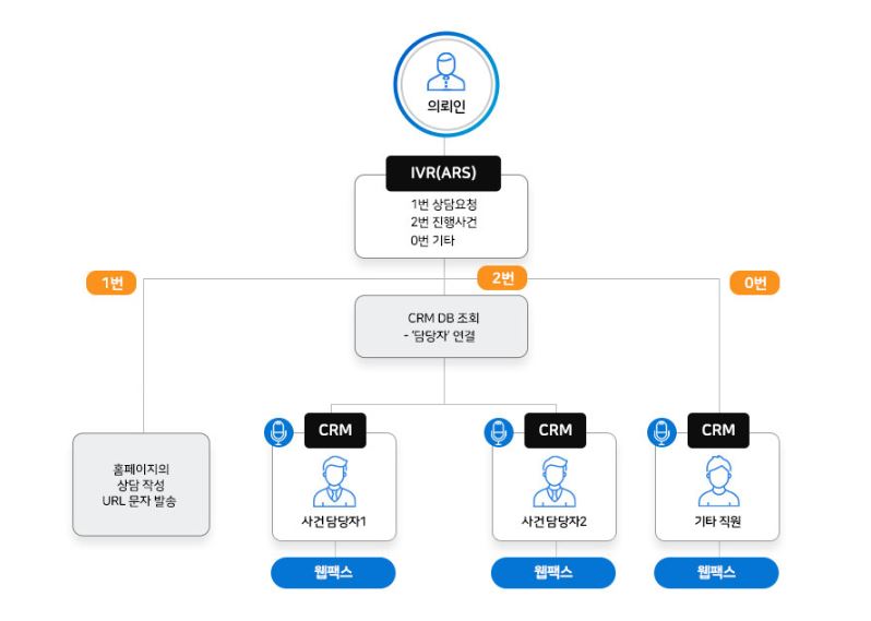 위는 한 법무법인의 아톡비즈 CRM과 ARS 사용사례 입니다. 신규 사건 문의와 기존 사건을 구분하고 신규 사건은 상담 URL을 발송하고, 기존 사건은 담당자로 바로 연결하였는데요.