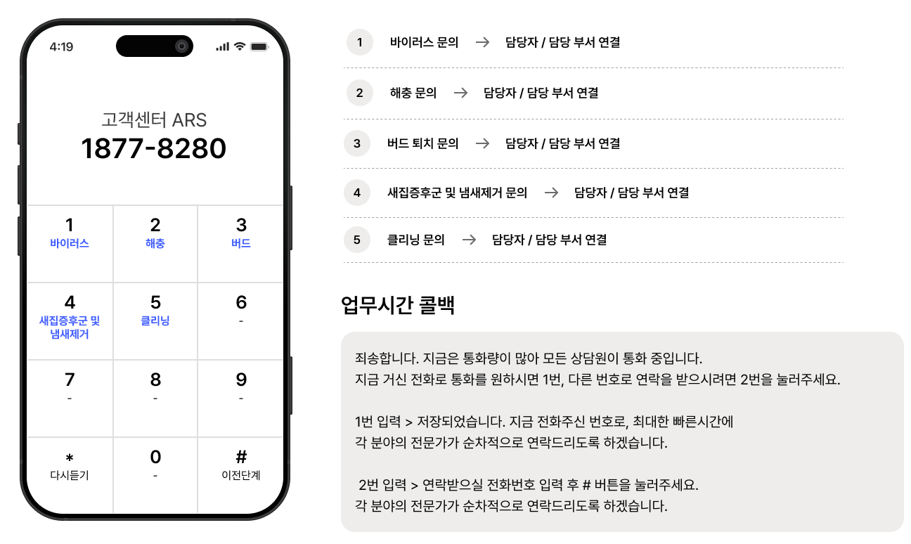 바이러스 문의는 1번, 해충 문의는 2번, 버드 문의는 3번, 새집증후군 및 냄새제거는 4번, 클리닝 문의는 5번을 눌러주세요.
