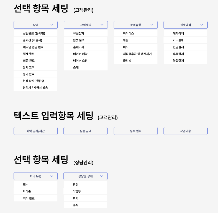 상담관리 항목 커스텀 (CRM) 상담 항목별 맞춤 커스텀 |