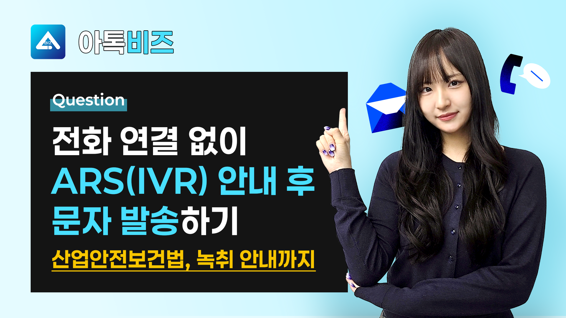 : 아톡비즈 ARS 서비스는 고객님들이 가장 많이 사용하시는 대표 서비스 중 하나로, 기업에서 원하는 안내멘트 시나리오로 자동 발송됩니다. 산업안전보건법 같은 직원 보호 멘트부터 초반 의무 상담이 아닌 번호 선택 유도로 담당부서,담당자 지정 및 통화 종료 후 ARS 메시지 발송까지 다양한 솔루션을 통해 업무의 전문성을 더할 수 있어요.