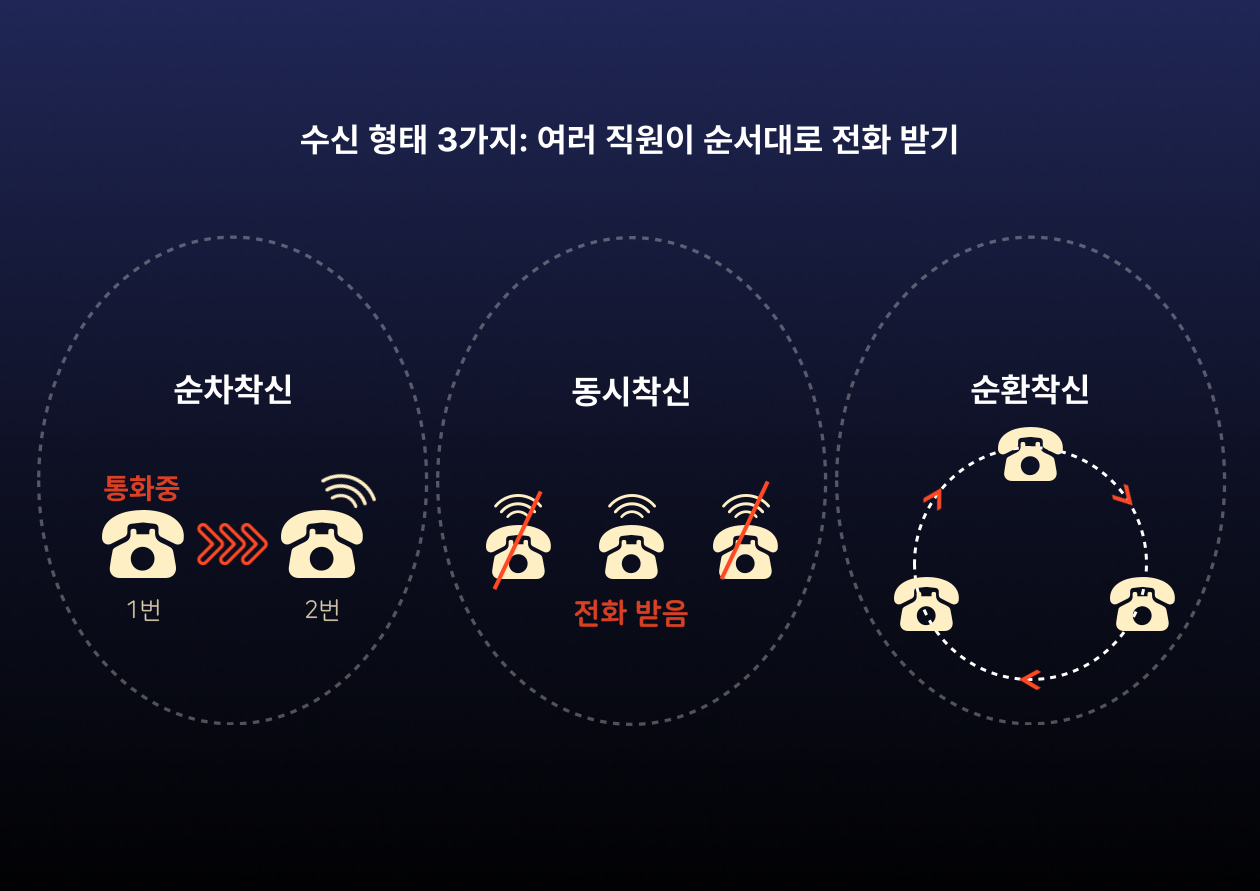 | 순차착신 | 첫 번째 직원이 통화 중이면 자동으로 다음 직원에게 전화가 넘어갑니다. |