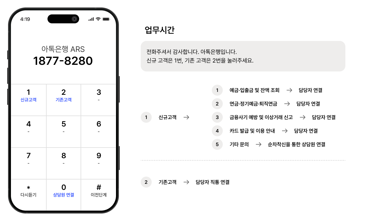 📞 "안녕하세요 아톡은행입니다. 신규 고객은 1번, 기존 고객은 2번을 눌러주세요."
