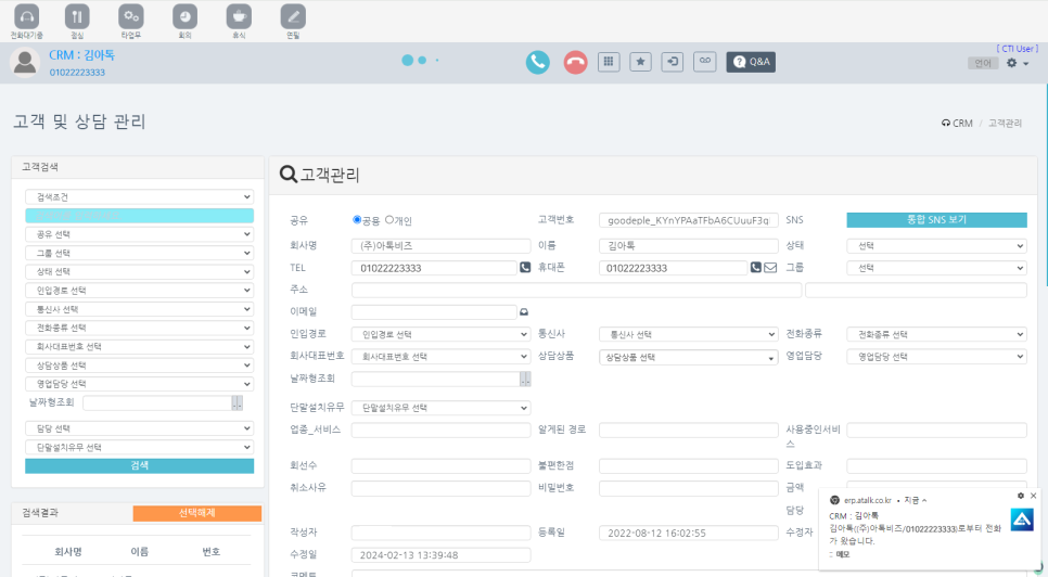 아톡비즈 솔루션은 단순히 고객DB 기록용으로 사용하는 CRM이 아닌 전화와 관련된 여러 서비스와 결합하여 사용할 수 있어 효율적이며, 담당자 자동연결, 알림톡 자동발송 등 고객별 맞춤 서비스까지 제공할 수 있습니다.