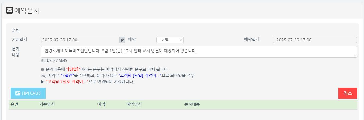 구독형이 주를 이루고 있는 렌탈업에서 빼놓을 수 없는 기능 중 하나인 예약 문자 기능도 활용이 가능해요.