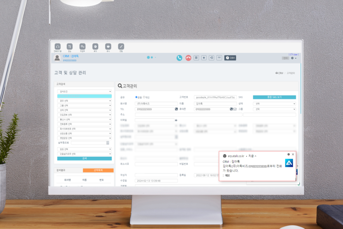 고객 유입 시 저장된 고객정보, 상담 정보를 자동으로 불러옴과 동시에 PC, APP으로 팝업을 뛰워줘 바로 확인이 가능해요.