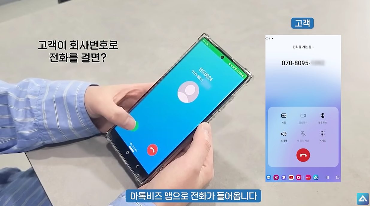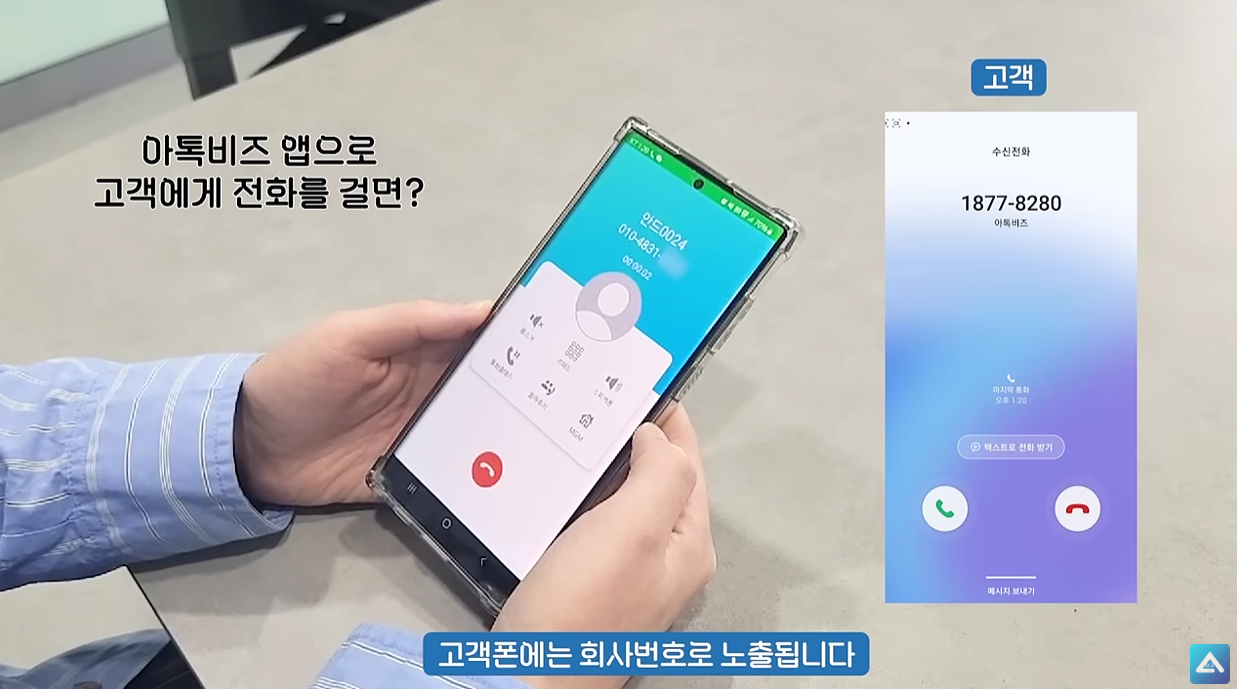 직원이 아톡비즈 앱으로 고객에게 전화를 걸면 고객에게는 회사 대표번호가 노출되어 수신됩니다.