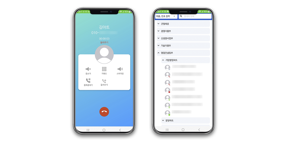 고객과 전화 중 다른 담당자에게 연결이 필요한 경우, 모바일에서도 조직도를 바로 확인하고 돌려주기가 가능합니다.