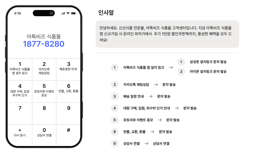 원하시는 서비스 번호를 눌러주세요. 온라인 최저가로 구매 가능한 아톡비즈 식품몰 앱 설치 링크 안내는 1번 / 카카오톡 메시지 링크 안내는 2번 / 평일, 주말, 공휴일 배송일정 안내는 3번 / 대량 구매, 입점, 위수탁 단가 안내는 4번 / 포토리뷰 이벤트 응모는 5번 / 반품, 교환, 환불 절차 안내는 6번 / 상담사 연결은 9번을 눌러주세요.