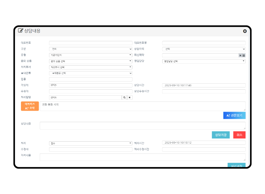 기존고객(재문의)의 경우 고객에게 전화 수신 시 고객데이터를 실시간으로 확인하면서 상담내용을 즉시 기록 가능한 자동등록과 상담내용을 실시간으로 기록하지 못할 상황일 때 고객검색 후 직접 기록이 가능한 수동기록으로 구분하여 편의에 맞게 고객관리가 가능해요!